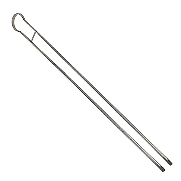 43″ long “Hairpin” shaped tong. Ideal for picking up lead buttons and placing on cupels in the oven. The flat paddle shaped pickup surfaces are gritted, and suited to cupels as well as lead buttons. Guide pin keeps tong in alignment.