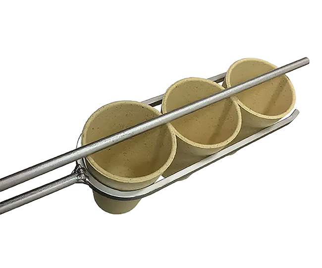 Tong for loading and pouring “three in a row” of 30, 40, or 45 gram crucibles.