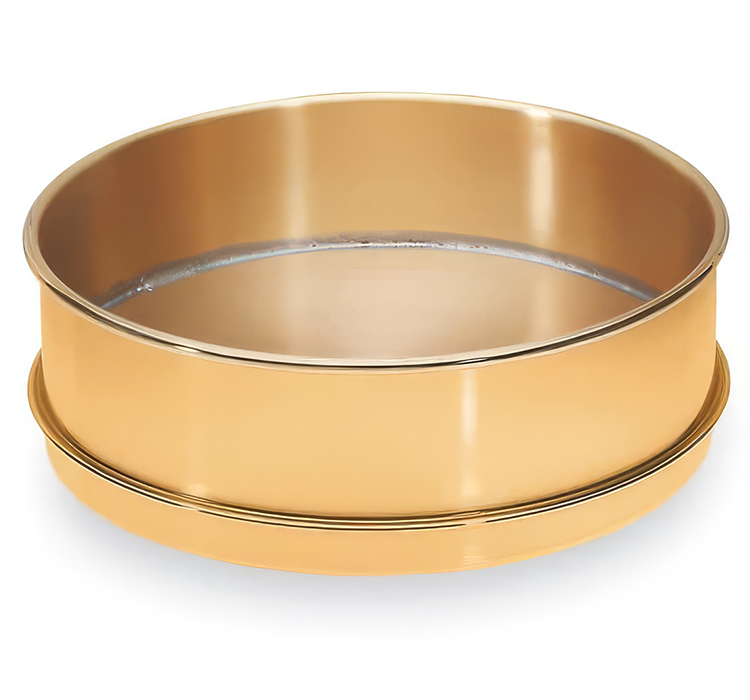 The ball-pan has a special 8mm thick hardened brass bottom plate dished out at 1,092mm inner radius to give a 3.2mm thickness at its center. The bottom plate is mounted in a standard full-height sieve frame with extended rim for stacking.