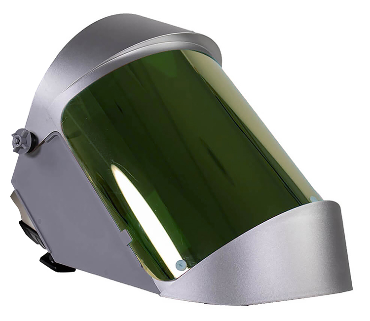 Green 8″ x 14″ x 0.100″ molded polycarbonate shield with a reflective layer of 24 karat gold protected by a scratch resistant coating on an outer surface and an anti fog coating on the inner surface.